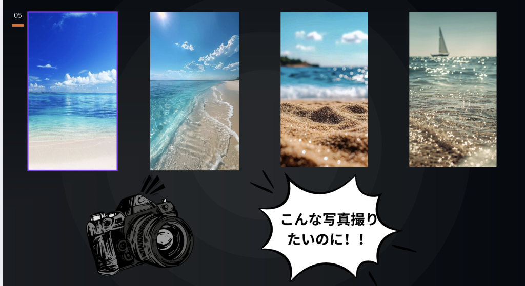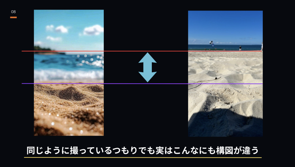 多くの人が、撮影した写真に物足りなさを感じる根本的な原因、それは「構図」にあります。以下の写真が示すように、撮りたいイメージと、実際に撮れた写真の間には、構図という見えない壁が存在するのです。